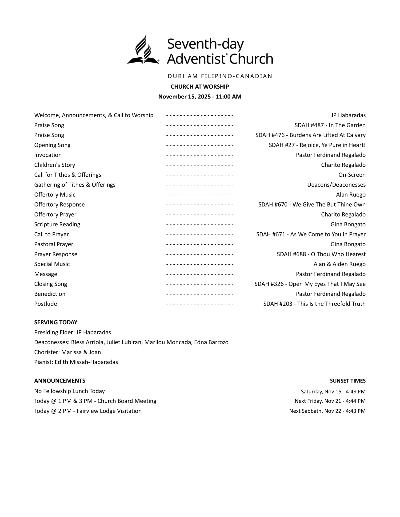 Church Bulletin for November 15, 2025